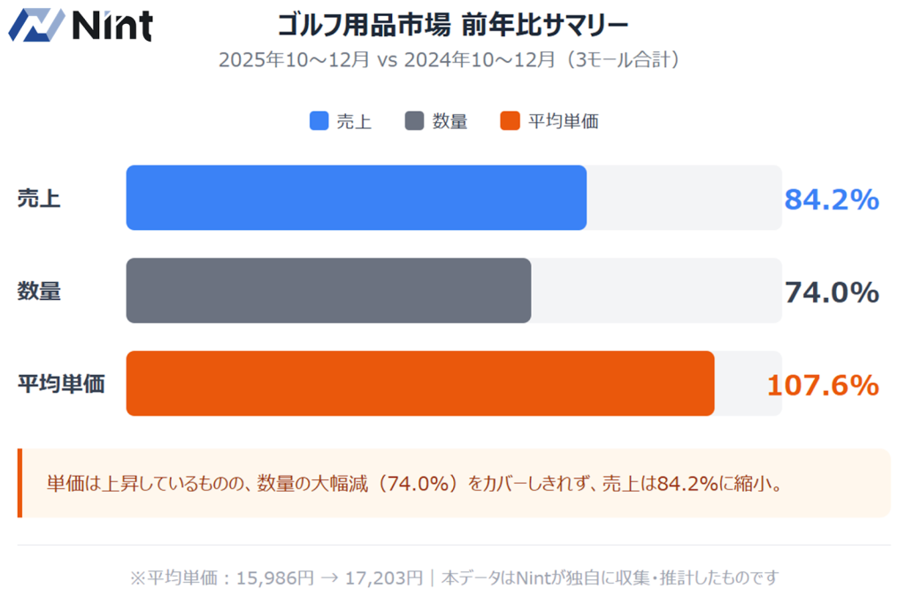 2025年10〜12月のゴルフ用品EC市場(3モール合計)は、売上前年比84.2%と縮小しました。 売上の変化もさることながら、特筆すべきは販売数量の落ち込みで、該当期間は前年比74.0%にとどまりました。