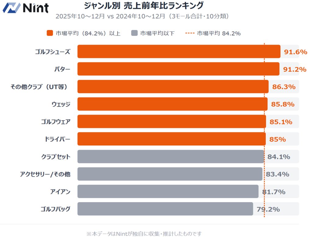 本記事では、Nintが保有するEC市場データをもとに、主要3モールにおけるゴルフ用品市場の動向を分析します。対象期間は2025年10月〜12月、前年同期(2024年10月〜12月)との比較を通じて、市場全体のトレンドからジャンル別・メーカー別・商品別の動きまでを読み解きます。