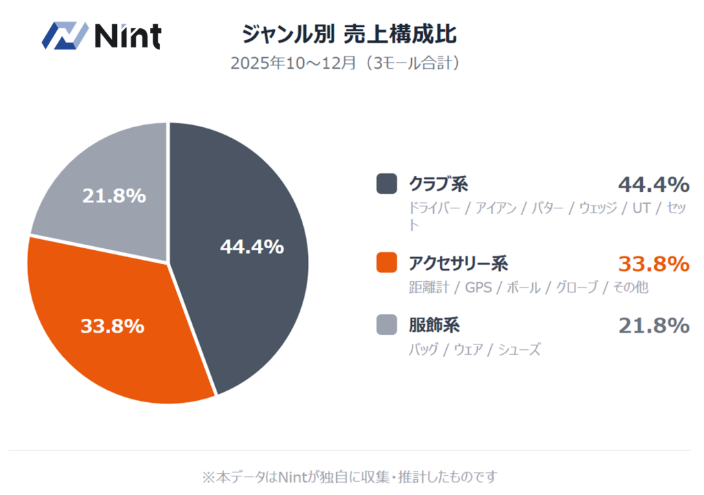 売上シェアの構成を見ると、前年からほとんど変動がありません。 売上構成比では、クラブ系6分類の合計が約44%で最大ですが、単体ジャンルとしては「ゴルフアクセサリー・その他」が約34%を占め、次いでバッグ・ウェア・シューズなど身につけるもの(服飾系)が約22%と、市場の構造は安定しています。