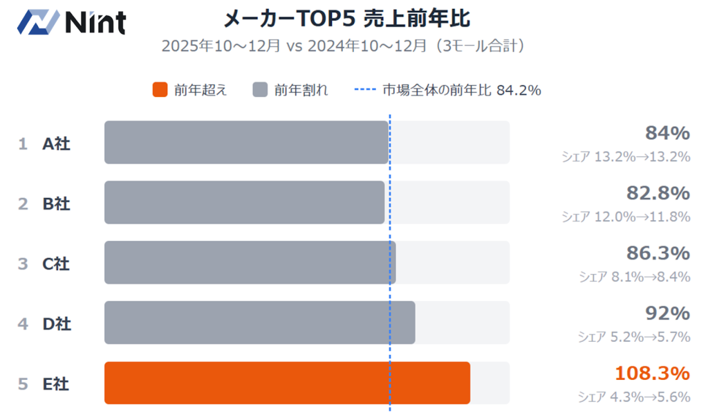 注目すべきは2点です。 まず、TOP5全社がシェアを維持もしくは拡大しています。市場全体が84.2%に縮小する中でも、上位5社の売上シェア合計は43.0%から44.6%へと微増しました。市場縮小の影響はTOP5以下の中小メーカーにより大きく出ており、上位への集中が進んでいるといえます。 もう1つは、E社の存在です。売上前年比108.3%、シェア4.3%→5.6%と、TOP5の中で唯一の前年超えを達成しました。