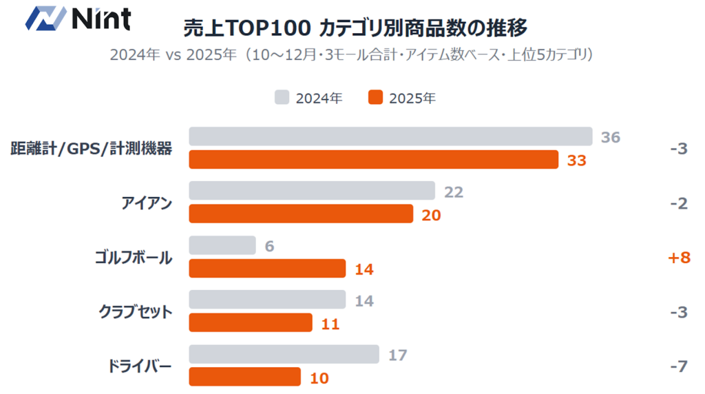 一方、ドライバーは2024年の17商品から2025年は10商品へと大きく減少しました。代わりに存在感を増したのがゴルフボール(6商品→14商品)です。ボールはECでのまとめ買いと相性が良い消耗品です。こうした消耗品の購買が底堅いことから、市場全体としては買い替え需要の少ない『苦戦のサイクル(谷間)』にあった可能性がうかがえます。