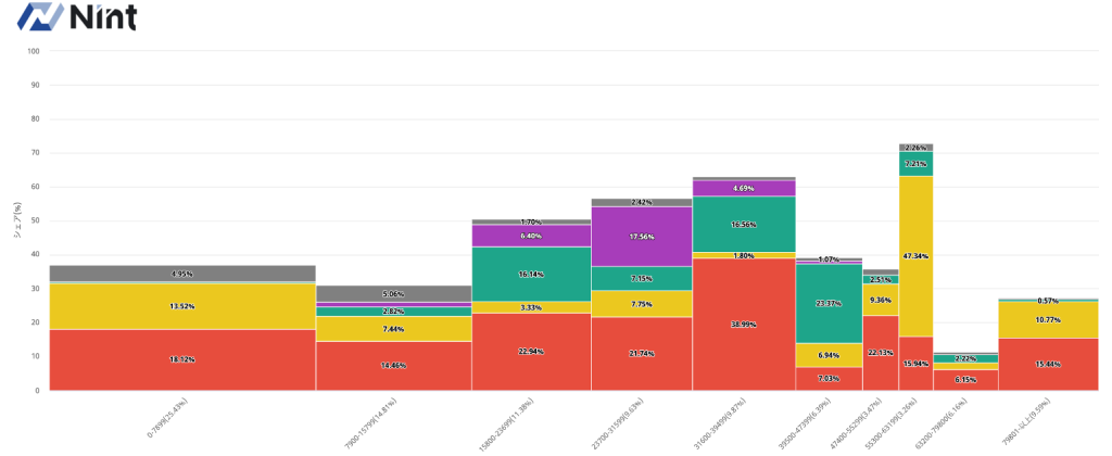 市場の見える化を実現するツール「Nint ECommerce」でTOP5メーカーの価格別売上構成比を見ると以下のように確認できます。