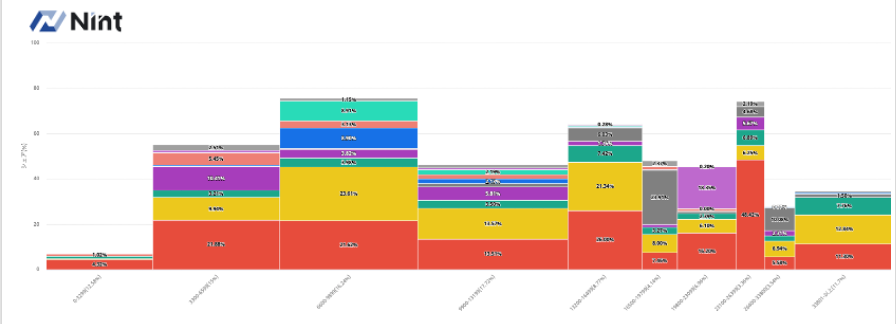 市場の見える化を実現するツール「Nint ECommerce」でTOPメーカーの価格別売上構成比を見ると以下のように確認できます。