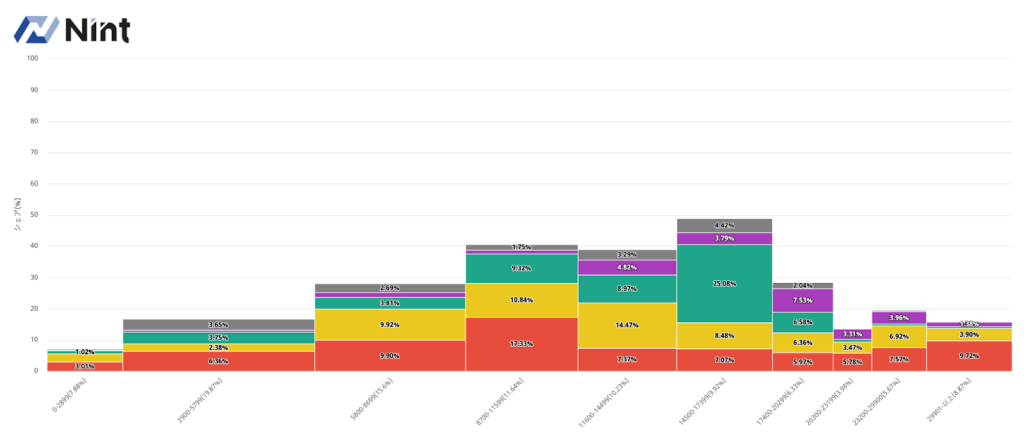 市場の見える化を実現するツール「Nint ECommerce」でTOP5メーカーの価格別売上構成比を見ると以下のように確認できます。