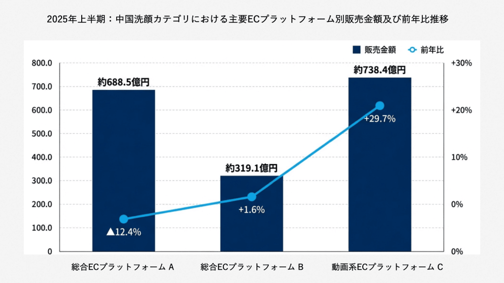 2025年上半期の中国EC市場における洗顔用品カテゴリーは、消費者の購買行動が従来の総合ECからショート動画・ライブ配信型プラットフォームへとシフトする大きな転換期を迎えました。