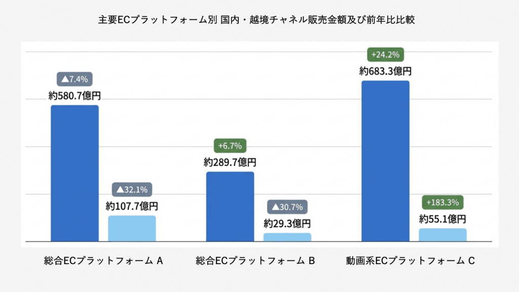 プラットフォームごとに、国内ECと越境ECの販売状況を整理しました。