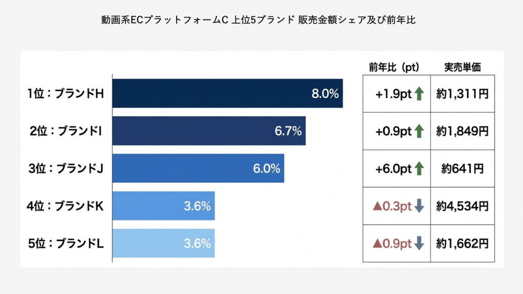 動画系ECプラットフォームCが前年比約30%増と急成長を遂げ、市場を牽引している一方、最大規模であったプラットフォームAは二桁の減少となりました。