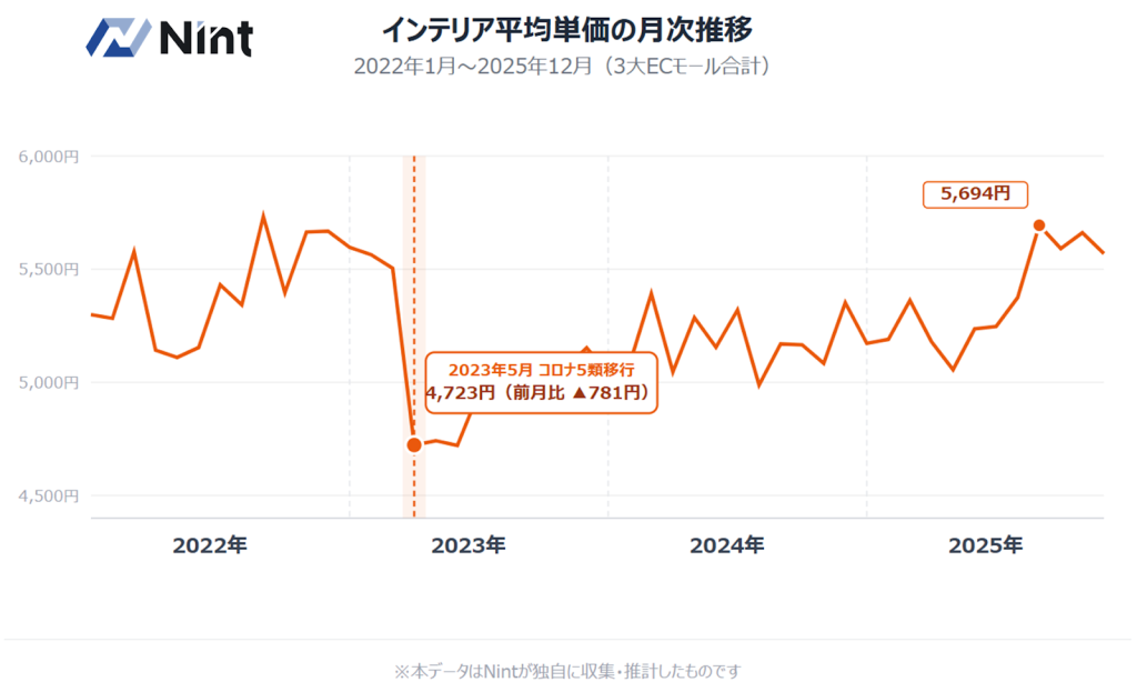 [図5:インテリア平均単価の月次推移(2022年1月〜2025年12月)]