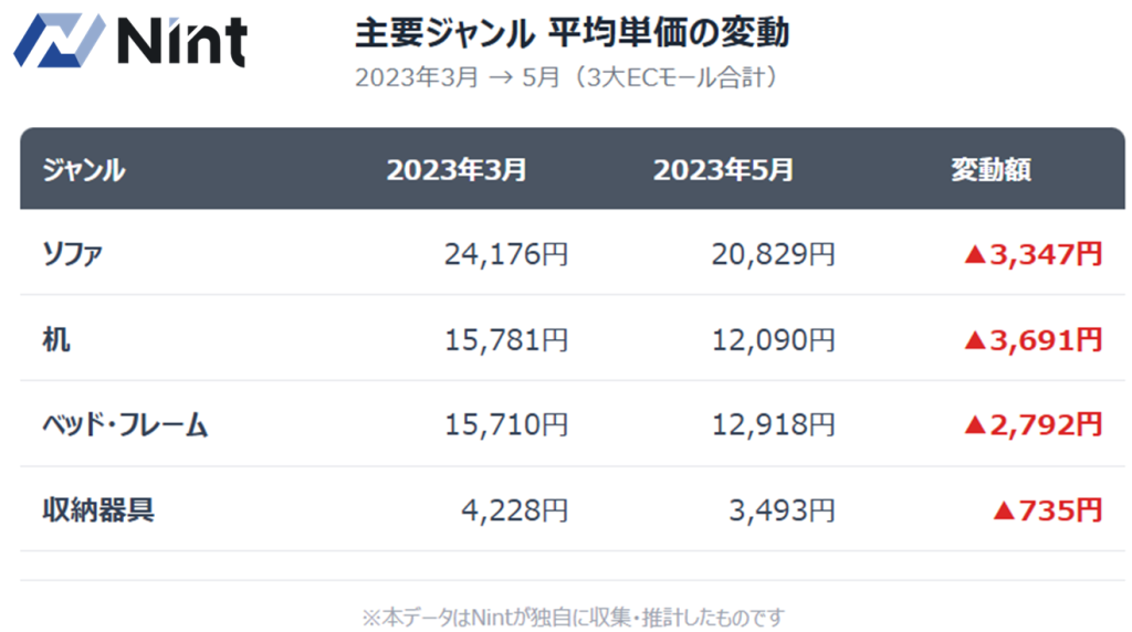 ソファは2023年3月の24,176円から5月には20,829円へ約3,300円の下落、机は15,781円から12,090円へ約3,700円の下落、ベッド・フレームは15,710円から12,918円へ約2,800円の下落と、いずれも数千円単位で急落しています。