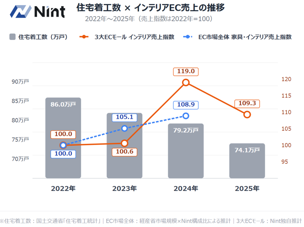 住宅着工数の減少にもかかわらずEC市場が拡大を続けている事実は、EC化率の上昇と既存世帯の買い替え需要がドライバーとなっていることを示しています。今後もショールーミングの定着とともに、「実物は店舗で確認し、購入はECで」という消費行動がインテリア分野で一層広がることが予想されます。