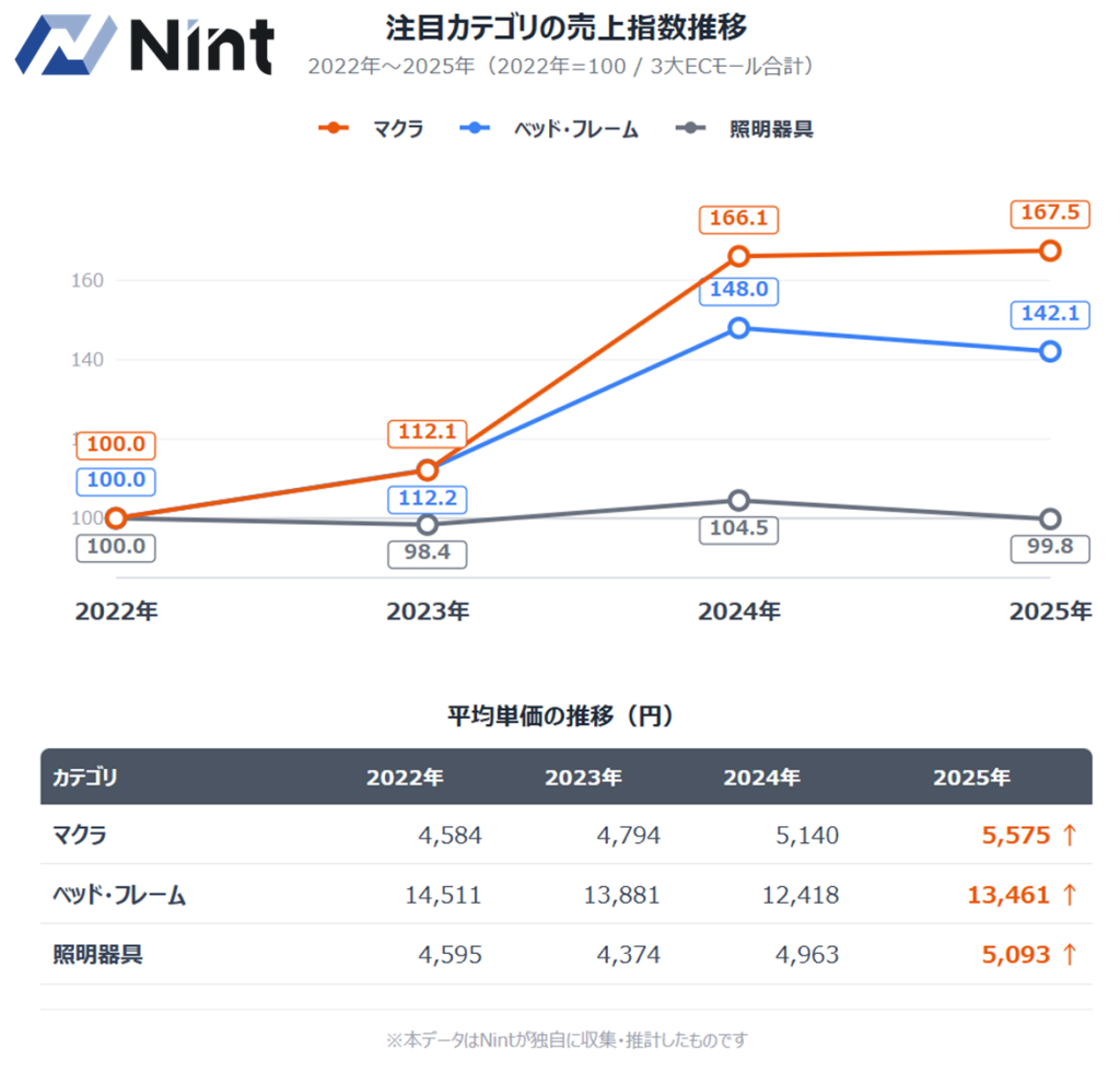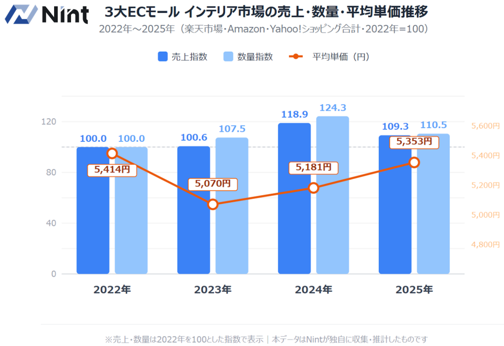一方で注目すべきは平均単価の動きです。インテリア全体の平均単価は2022年の5,414円から2023年に5,070円へと下落したものの、2024年は5,181円、2025年は5,353円と回復傾向が鮮明になっています。