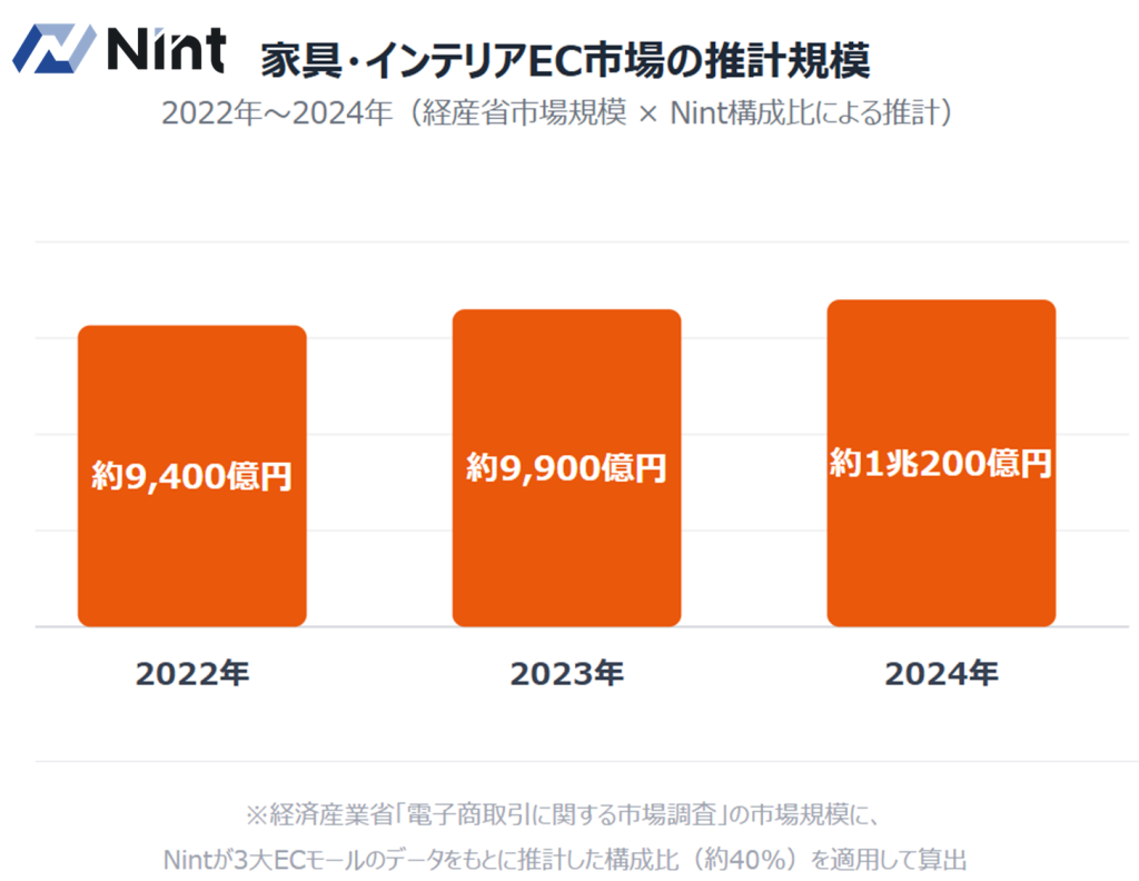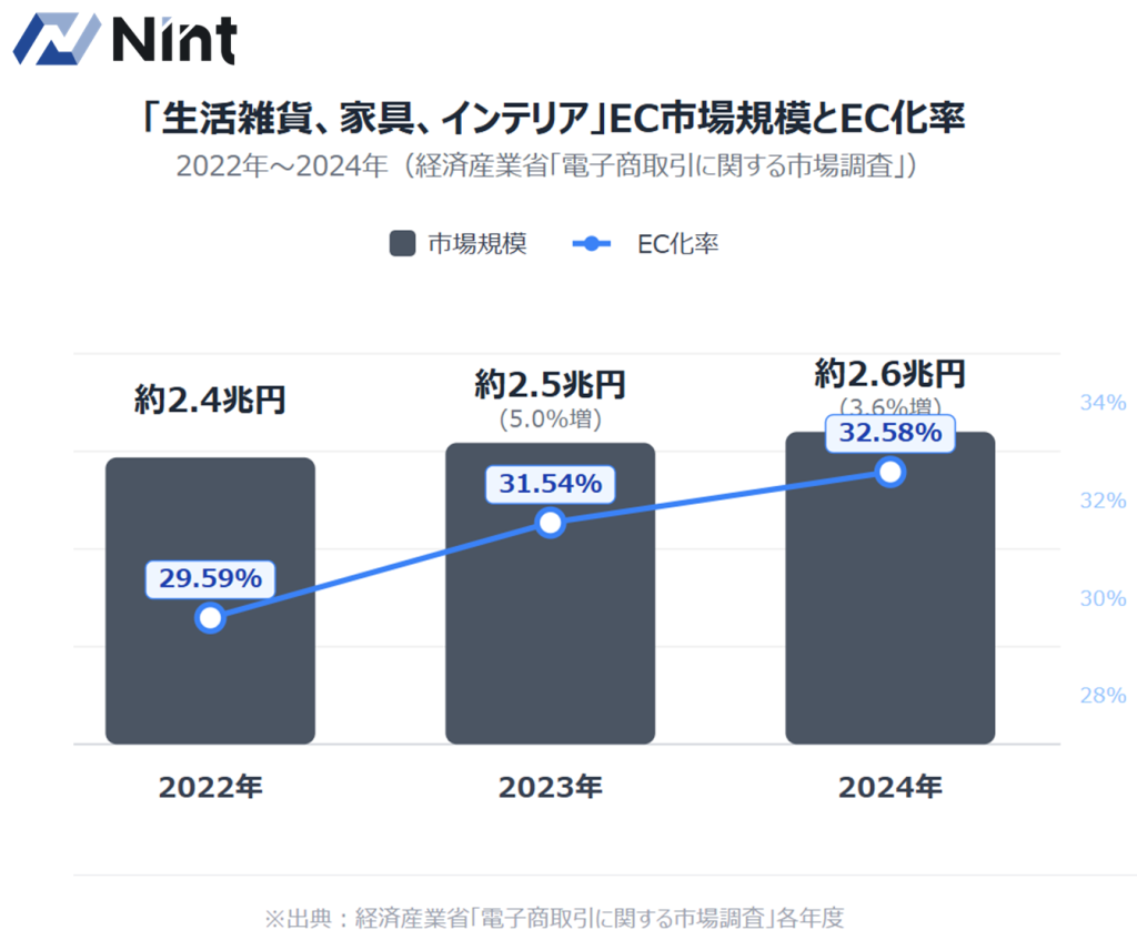 家具・インテリアのEC市場は、経済産業省調査ベースで2兆5,616億円(2024年)、EC化率は32.58%と、物販系の中でも高い水準にあります。Nintのデータから推計すると、そのうちインテリア・家具に該当する部分は約1兆円規模です。