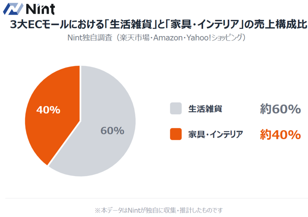 Nintでは、EC市場の約7割を占める、楽天市場・Amazon・Yahoo!ショッピングの3大ECモールにおける商品データを独自の分類により「生活雑貨」と「家具・インテリア」に分類しました。