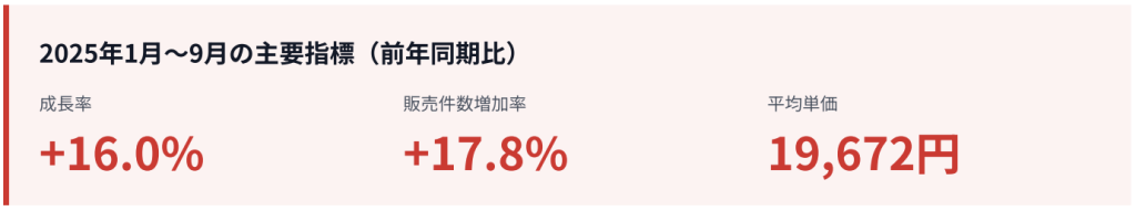 2025年1月~9月の期間において、楽天ふるさと納税市場は前年同期比で16.0%の成長を記録しました。販売件数も17.8%増加しており、利用者数の拡大が市場成長を牽引していることがわかります。平均単価は19,672円となり、前年から301円減少しましたが、これは幅広い価格帯の返礼品が選ばれるようになったことを示しています。