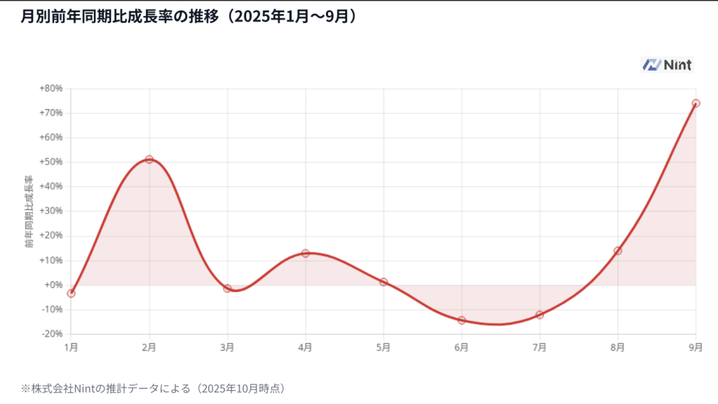 6月は前年同期比-14.3%、7月は-12.1%と減少傾向が続きましたが、8月は+14.0%と回復し、9月は制度改正を前にした駆け込み需要により+74.0%という高い成長率を記録しました。
