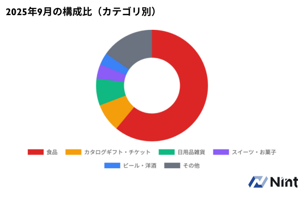 食品カテゴリが構成比61.0%を占め、精肉・肉加工品、魚介類・水産加工品、フルーツ・果物が人気を集めています。カタログギフトは前年同期比1,864.4%という驚異的な成長を記録し、受取人が自由に選べる利便性が高く評価されています。
