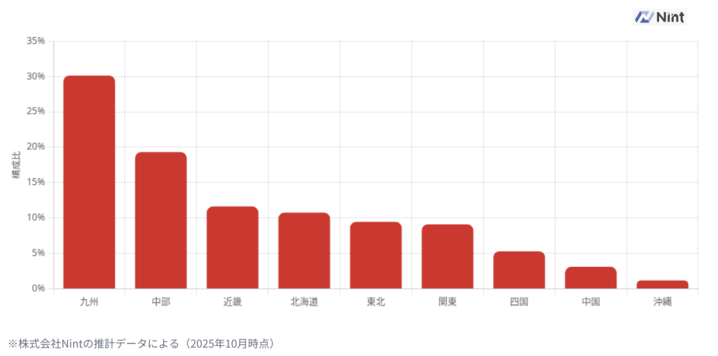 2025年9月の地域別・県別の構成比を分析すると、九州地方が圧倒的な人気を誇っていることがわかります。ここでは、地域別と県別のランキングを詳しく見ていきましょう。