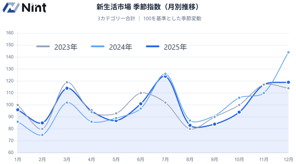 図1:3カテゴリーで構成される新生活市場の季節指数推移
