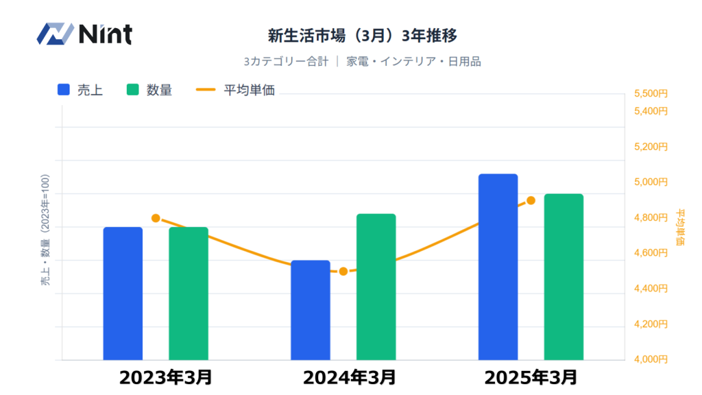 図2:新生活市場(3月)の売上・数量(2023年3月ベース)と平均単価推移