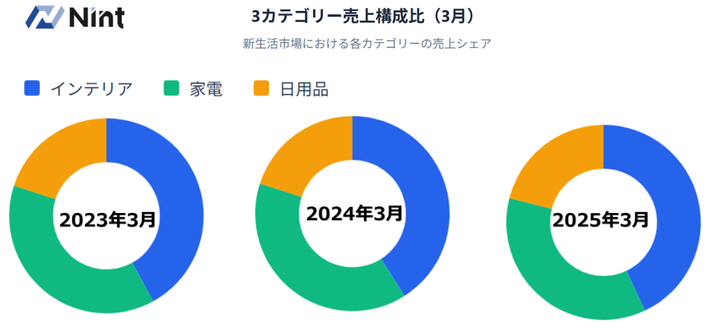 今回、3大ECモールのデータをもとに、新生活に関わるジャンルを3つのカテゴリーに分類し「新生活市場」として定義しました。