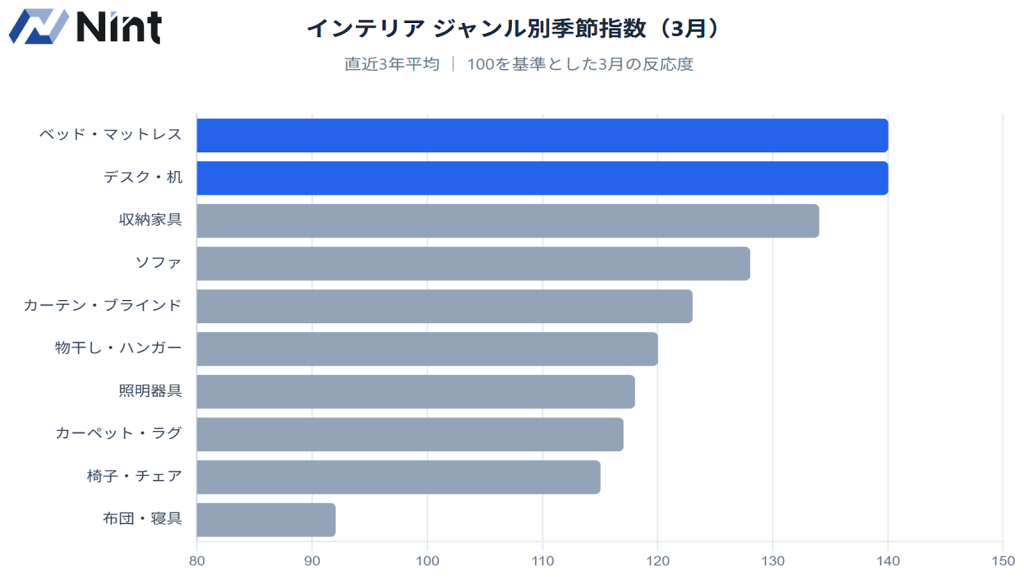 新生活では「住む場所が変わる」ケースが多く、ベッド・カーテン・収納家具といったインテリア商品の需要が高まります。家電や日用品は既に持っているものを継続利用できますが、インテリアは引越しに伴い買い替えが発生しやすいカテゴリーです。