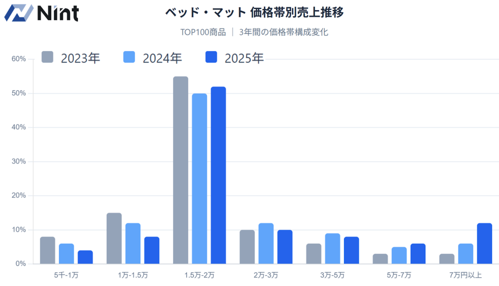 2024年は6品、2025年は13品と7万円以上の商品が売上TOP100商品内に多くランクインし始めています。プレミアム商品には、「質」や「機能性」が求められることが多いため、言い換えるとこの動きは、「睡眠に投資する」という意識を持つ消費者が増えていると言えそうです。
