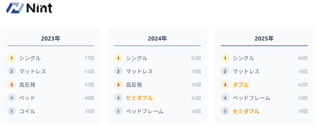 「シングル」「マットレス」「高反発」は3年連続で上位です。2025年の変化として、「セミダブル」「ダブル」の出現頻度が上昇しています。
