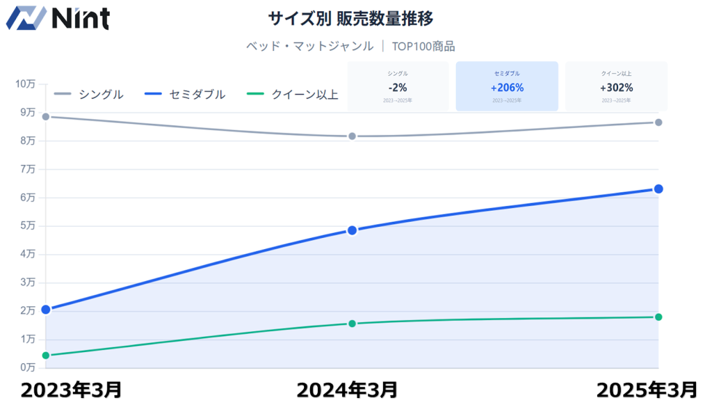 セミダブルの販売数量は、2023年から2025年で約3倍に増加しました。クイーンサイズ以上の販売数も同様に伸びています。