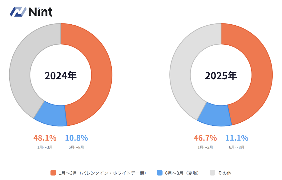 バレンタイン・ホワイトデー期である1月〜3月の売上構成比は減少しており、2023年は55.5%、2024年は48.1%へ減少し、2025年には46.7%まで低下しました。一方で、夏場(6月〜8月)の売上は前年比113%と、市場全体の成長率(約110%)を上回るペースで拡大しています。また、構成比も0.3%の上昇が見られます。