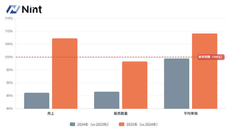 注目すべきは、販売数量は微減が続いているにもかかわらず、平均単価が前年比109%と大幅に上昇した点です。2023年から2025年にかけて平均単価は約150円上昇しており、昨今の物価高騰による値上げの影響や、消費者のプレミアム志向が顕著に表れています。