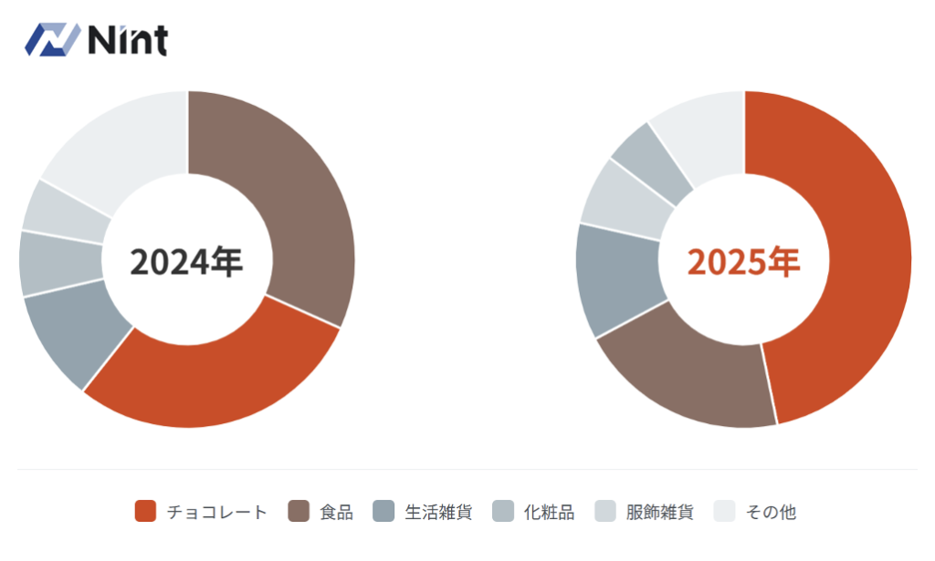 チョコレートの構成比は2024年は29.0%、2025年は46.8%に増加。食品(チョコレート以外)の構成比は2024年は31.7%、2025年は20.4%に減少。