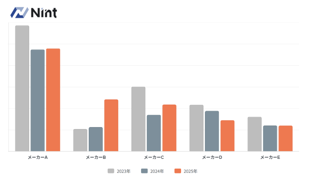 特に注目すべきはメーカーB(国内大手)の躍進です。メーカーBは2年連続で成長を続けており、2025年は前年比214%と大幅な伸びを記録しました。