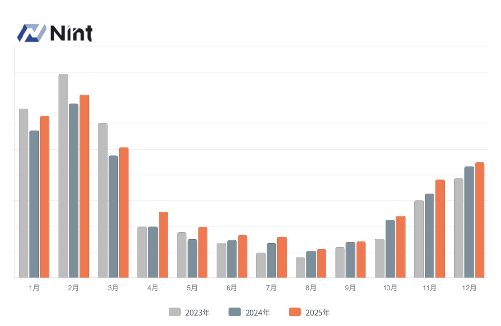 しかし、年間売上から各月のチョコレート市場の構成比を見てみると、2024年・2025年で変化が見られます。