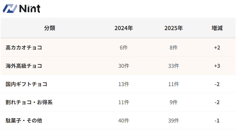 3モール合計のTOP100商品を分類別に集計すると、2024年から2025年にかけて高カカオチョコレートと海外高級チョコレートのランクイン数が増加(36件→41件)していることがわかりました。