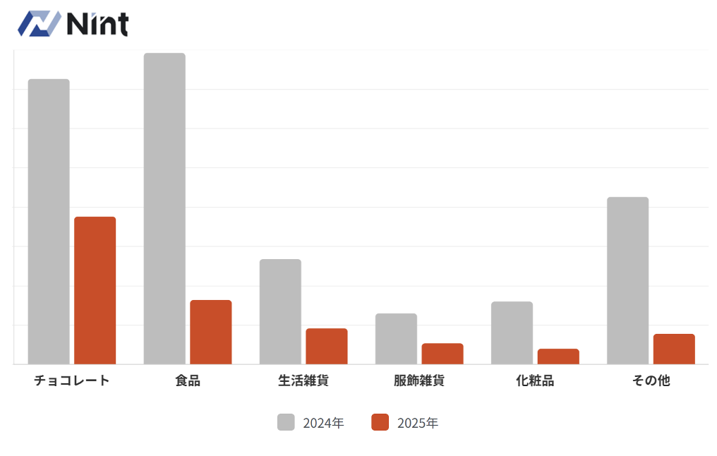 ただし、これは市場の縮小ではなく、タグ付け戦略の変化と考えられます。2024年は「バレンタイン」タグを幅広いジャンル(食品、化粧品、酒類など)に付けていましたが、効果が限定的だったため、2025年はチョコレート系に絞ったタグ付けに戻した可能性が高いです。