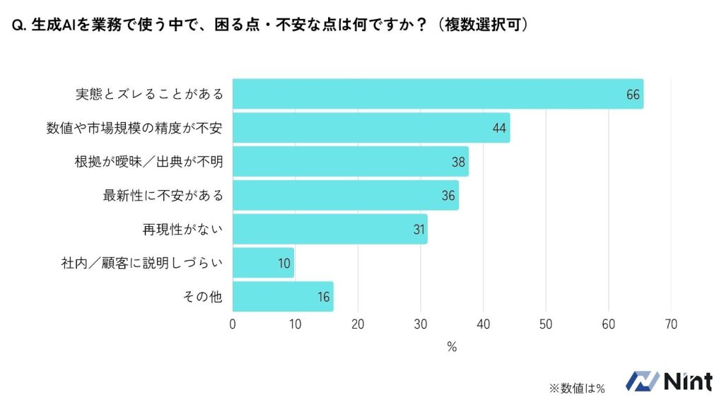 - 一方で、約7割が「実態とズレることがある」、約5割が「数値・市場規模の精度」に不安を感じていることが判明