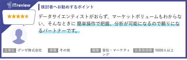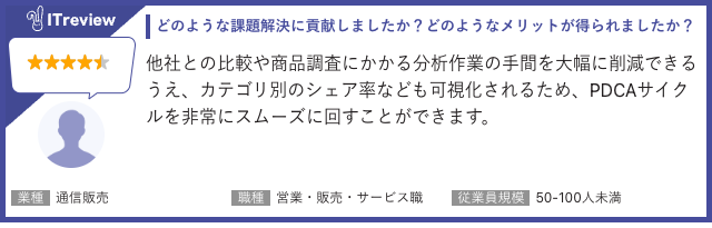 レビューでは、「商品開発」「販売商品の選定・仕入れ」「販売施策」などさまざまなシーンの中で合理的な判断をするにあたり欠かせないツールとしてご活用いただいているとのお声を多数いただいています。